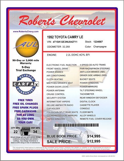 | 3. Print the Sticker! With AutoPlus Express you can instantly print custom stickers with vehicle data, dealer logos, water marks, and custom text in full color using a variety of AutoPlus forms. Print FTC Buyers Guides with up to 7 customized warranties. AutoPlus gives you the control, we make it easy and we back you up with great tech support! Place the completed AutoPlus Window Sticker on the vehicle. If you are a vendor, AutoPlus Express will print an invoice for the dealer. |